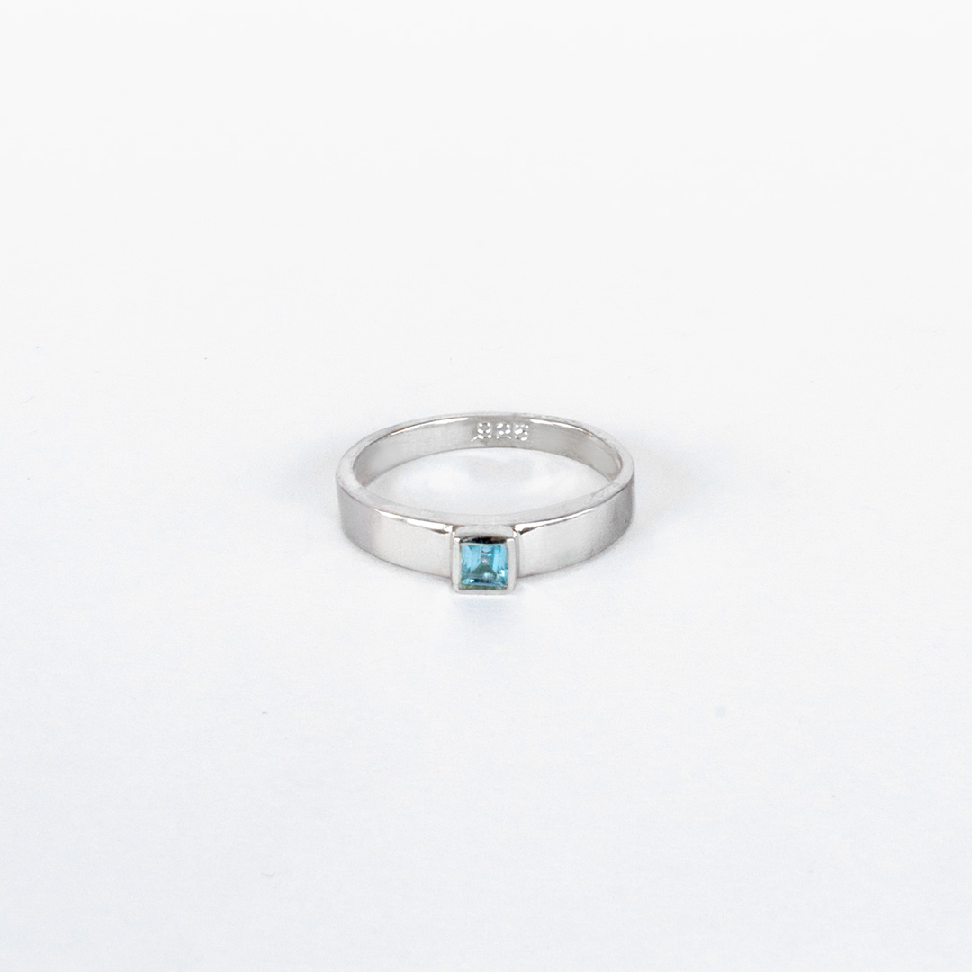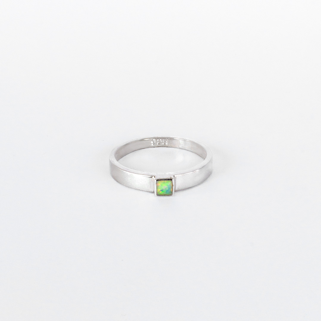 Argolla de plata .925 con un diseño minimalista y elegante. Al centro, una piedra de corte cuadrado montada en bisel aporta un toque de color sutil y moderno. La piedra puede variar según disponibilidad (ópalos, circonias, entre otras), lo que hace que cada anillo sea ligeramente diferente y único.
