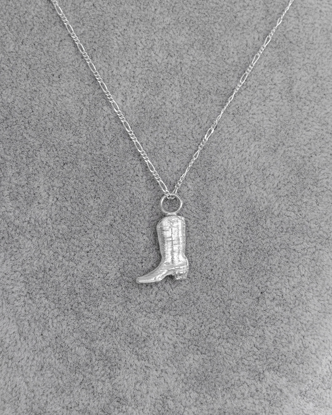 Collar de plata .925 con un dije en forma de bota vaquera, ícono del carácter del norte de México. La pieza fue modelada digitalmente e impresa en 3D, para luego ser vaciada artesanalmente en plata, lo que combina tecnología de precisión con el valor del trabajo manual.