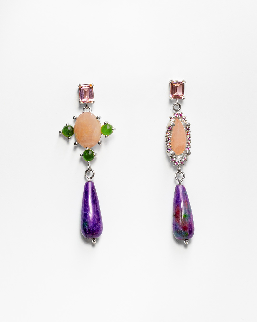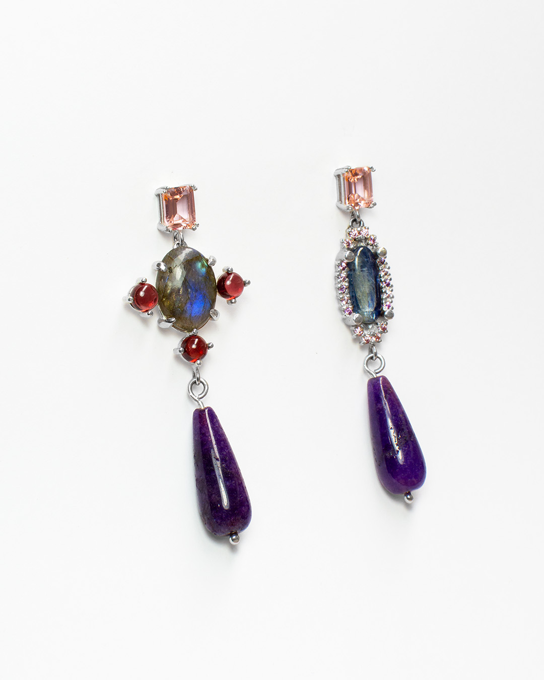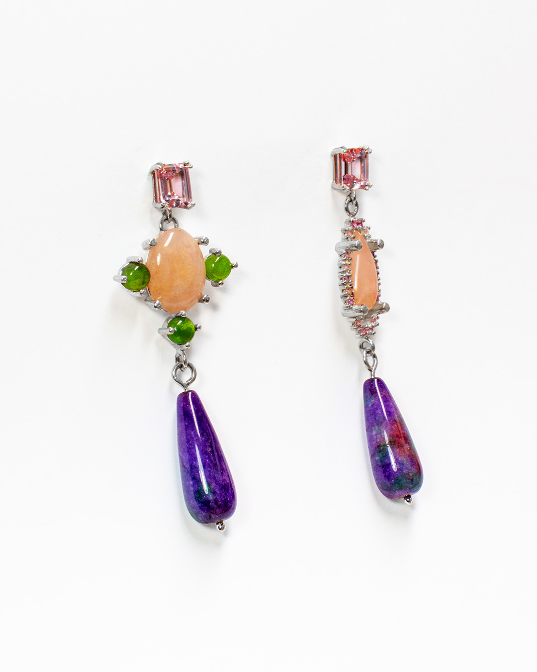 Hechos a mano en plata .925, combinan piedras en distintas formas y colores —una composición que recuerda los reflejos de un vitral contemporáneo. Cada par es una pequeña escultura que captura la luz de manera única.