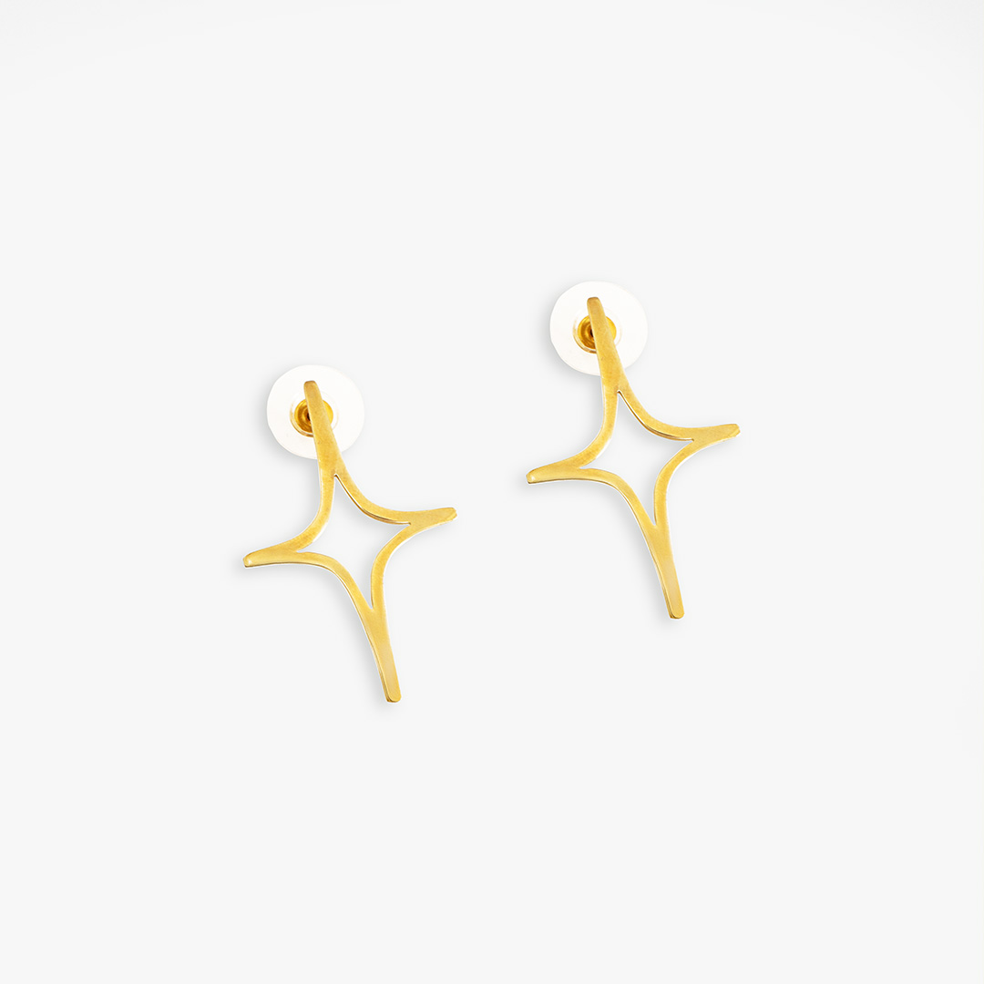 Aretes con diseño inspirado en las primeras constelaciones que emergen al caer la noche en el cielo de Coahuila. La figura central, con forma de destello alargado y contorno limpio, representa una estrella recién aparecida.