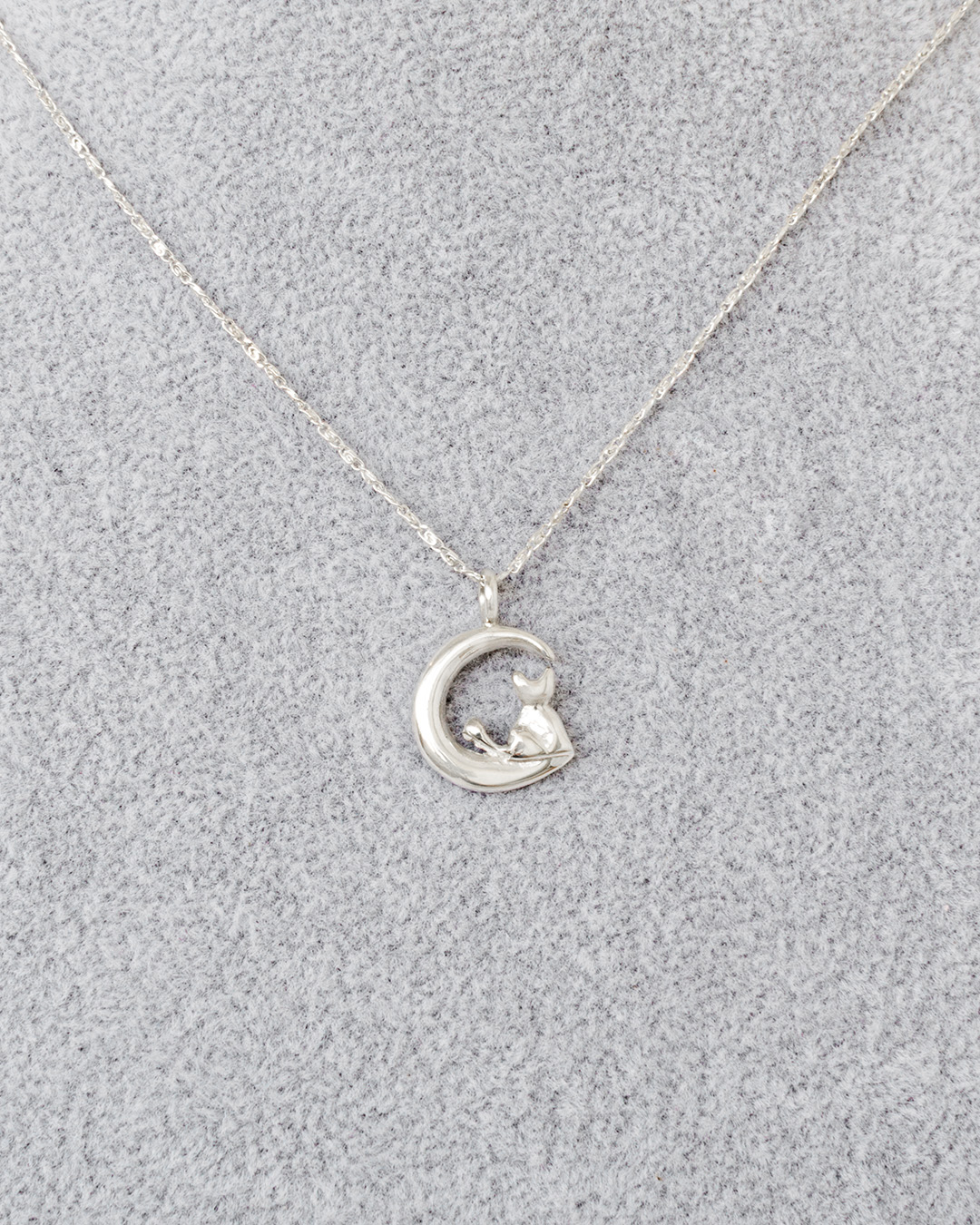 Collar de plata .925 con un delicado dije que representa a un gatito sentado dentro de una luna creciente. La silueta combina ternura y misticismo, evocando calma, protección y conexión con lo nocturno.