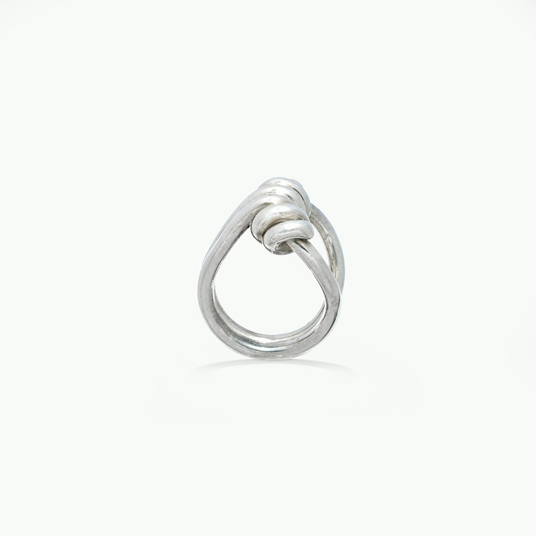 Anillo de plata .925 con un diseño audaz en forma de nudo grueso. Esta pieza escultórica resalta por su volumen y presencia, evocando fuerza, conexión y permanencia. El acabado pulido resalta las curvas del diseño y le da una estética contemporánea con aire atemporal.