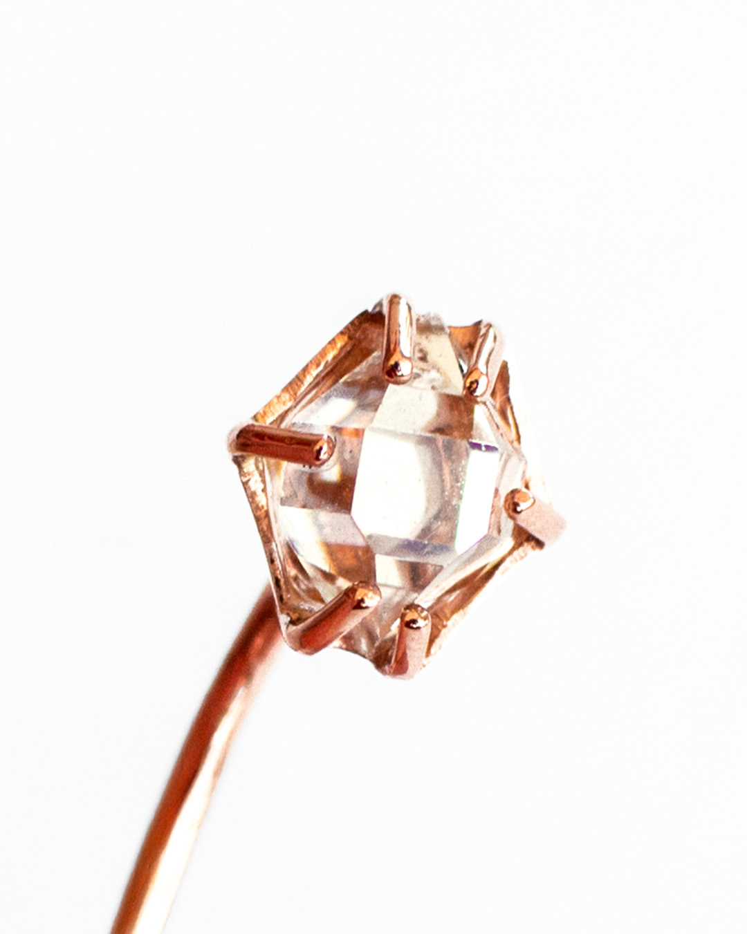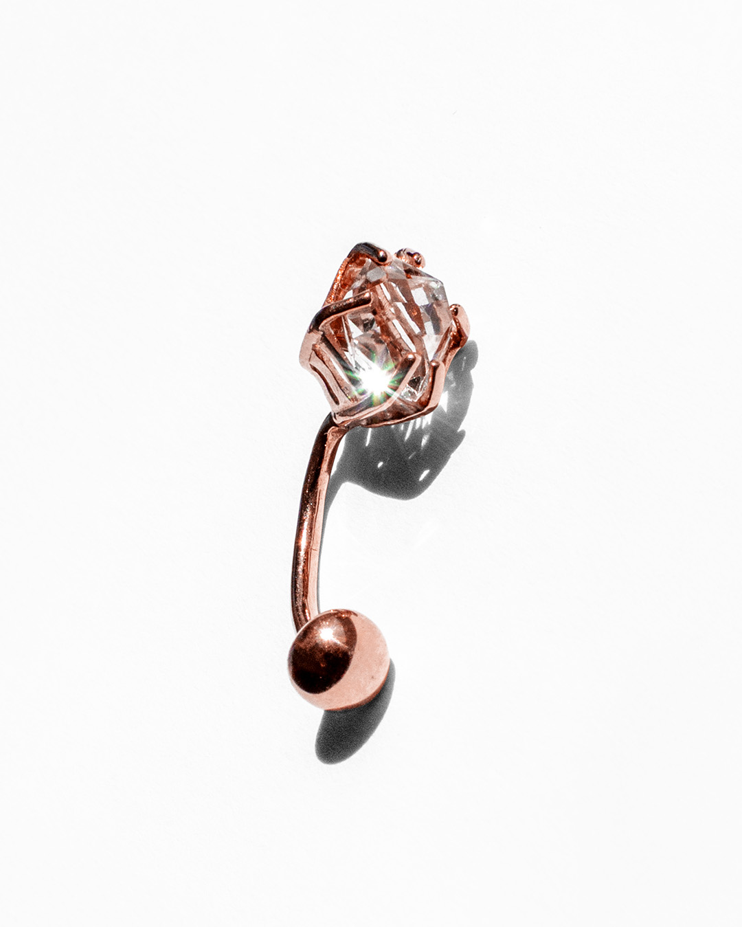 El Piercing Hexy celebra la belleza cruda y geométrica del diamante Herkimer, una gema natural con brillo propio y forma hexagonal única.