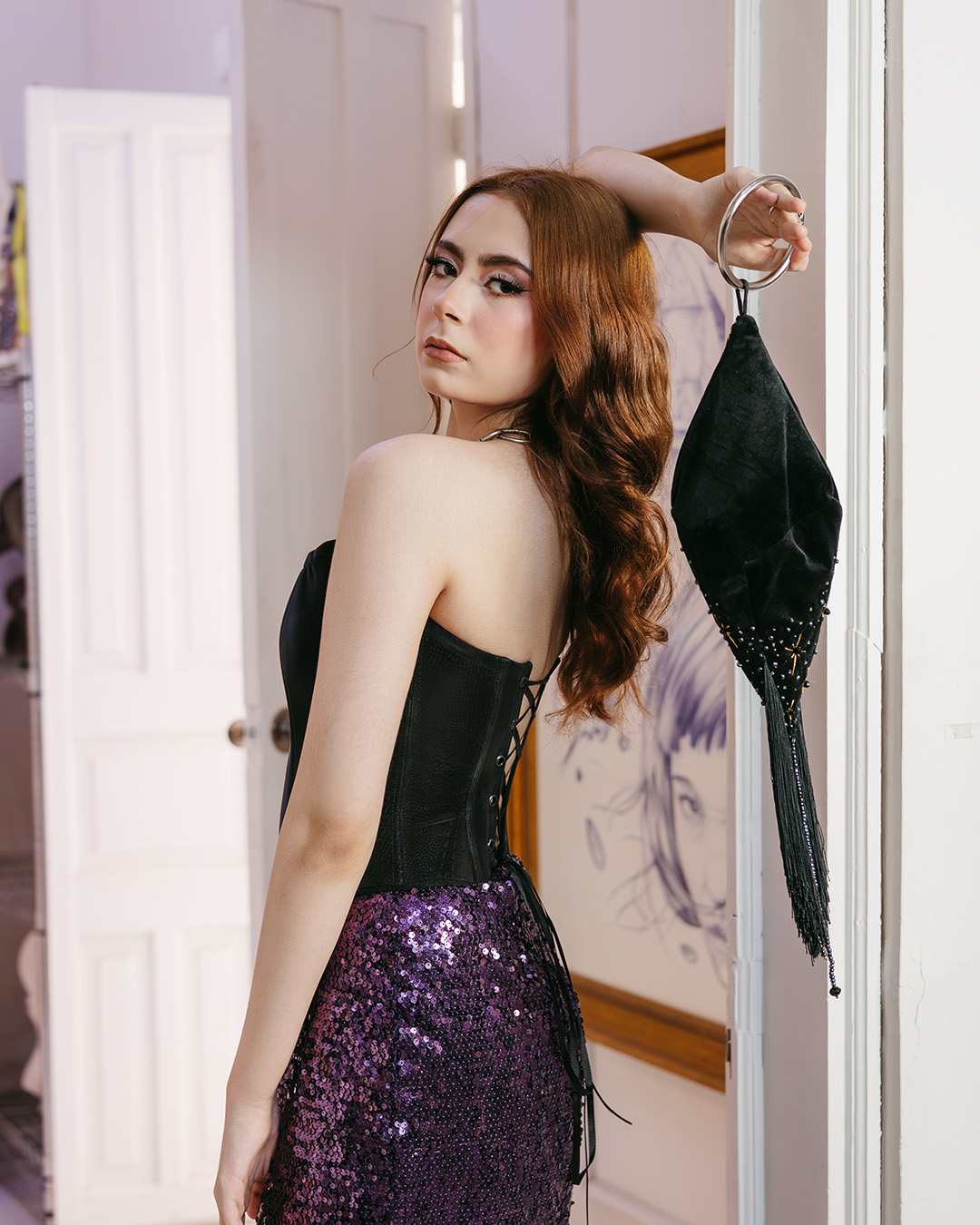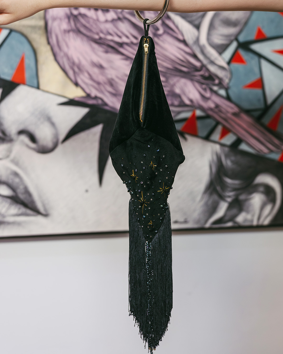 Bolsa rombo de terciopelo negro con destellos bordados en dorado y pompón de barbas. Diseño de Paulina Meza, confeccionada a mano por Diana Cardona en Torreón. Edición limitada.