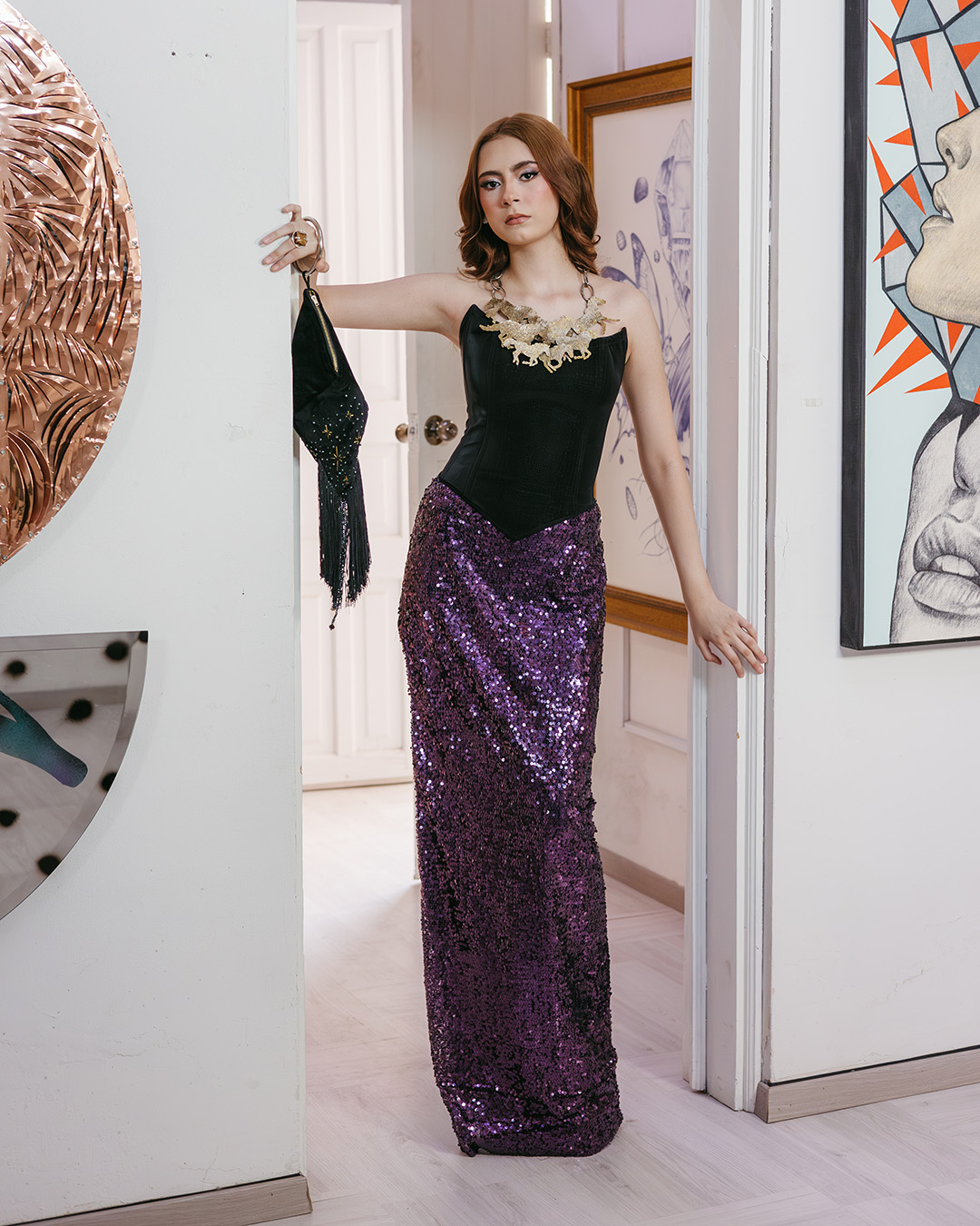 Diseñada por Paulina Meza y confeccionada artesanalmente en Torreón por Diana Cardona, esta bolsa de edición limitada fusiona elegancia y originalidad. Su forma geométrica en rombo rompe con lo convencional, mientras que el textil tipo terciopelo negro con destellos bordados en dorado aporta un acabado sofisticado.