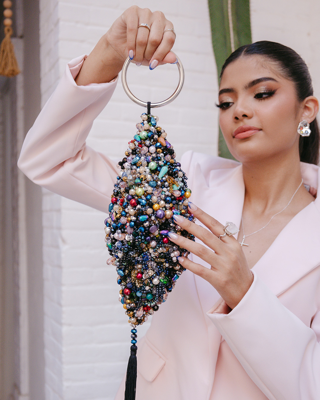 Bolsa rombo cubierta con un bordado de cuentas multicolor. Diseño de Paulina Meza, confeccionada a mano en Torreón por Diana Cardona.