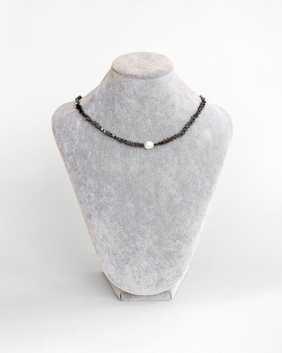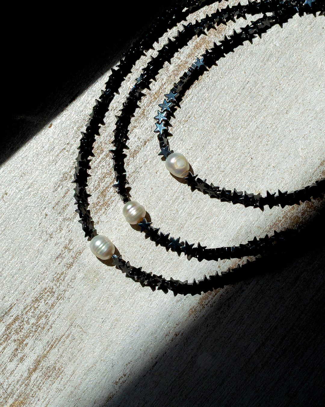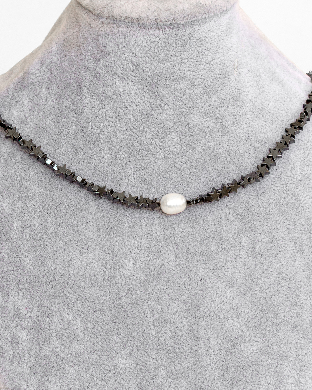 Gargantilla hecha a mano con cuentas de hematita en forma de estrella y una perla natural como elemento central. La combinación del brillo metálico de la hematita con la textura orgánica y única de la perla crea un contraste equilibrado entre lo estructurado y lo natural.